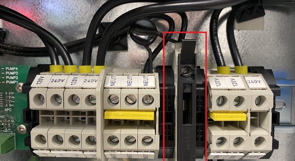 Using a multimeter, confirm the bottom part of the terminal strip is receiving power and is registering 120V (see #1 on image)